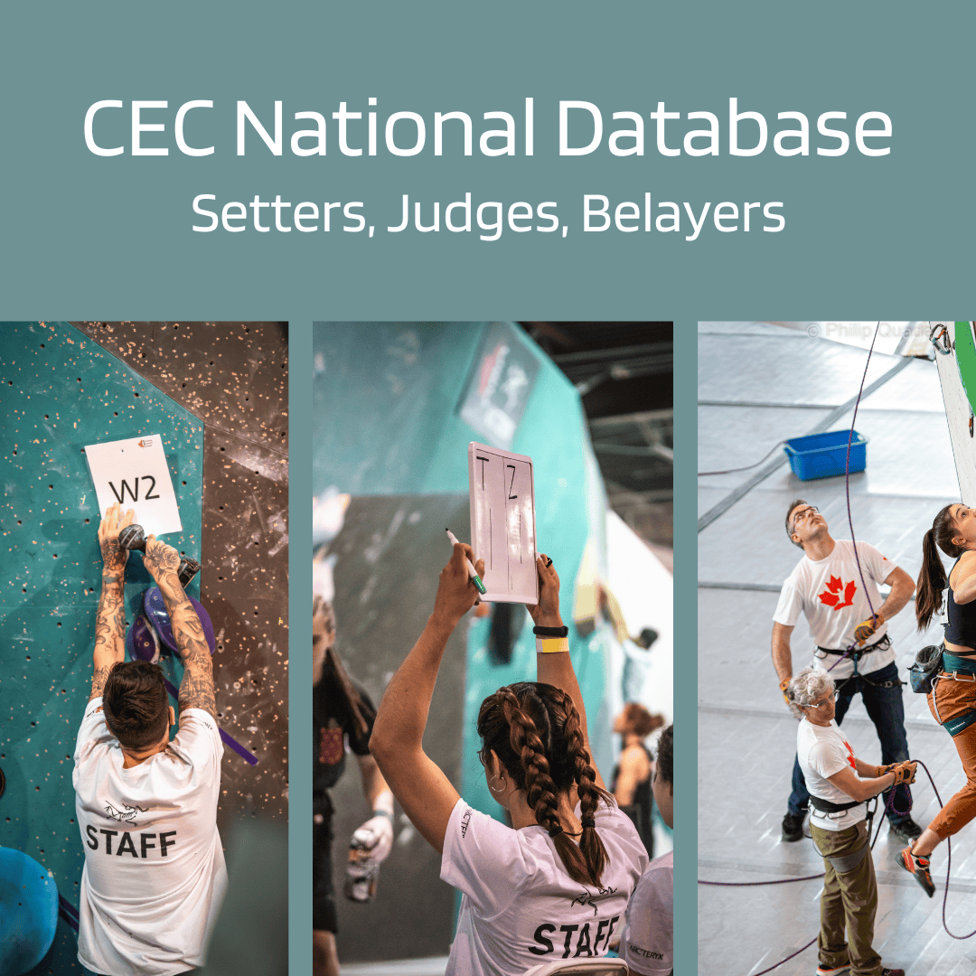 In an effort to improve the quality, quantity, and diversity of our Event Leadership Teams , CEC and its Provincial and Territorial Partners are launching a National Database Program in order to collect and store a list of individuals interested in participating in running Competitive Climbing Events.
