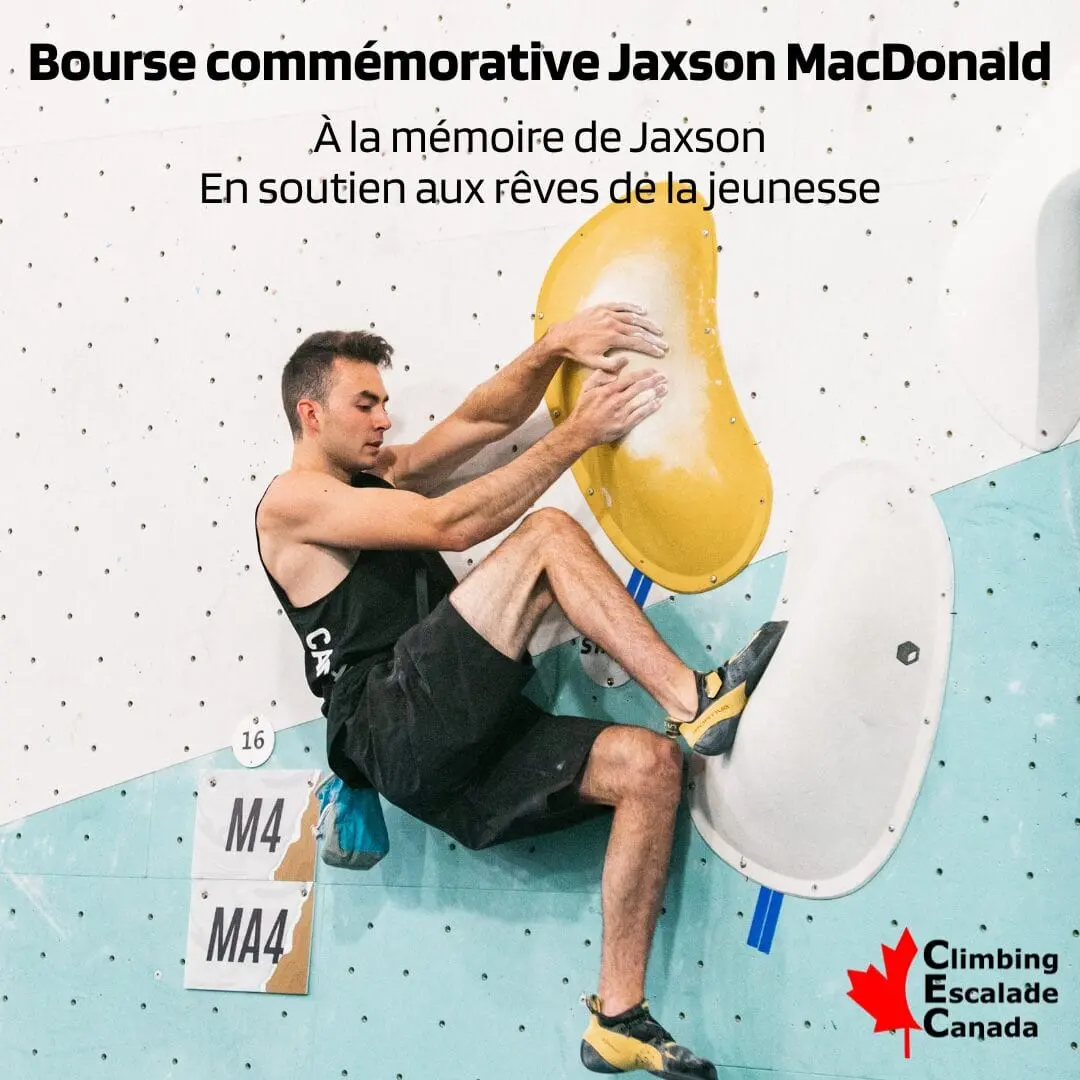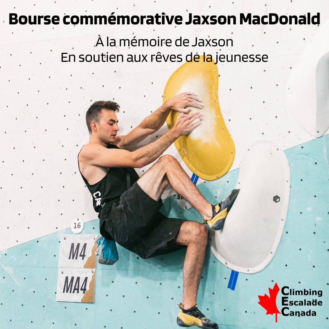 Climbing Escalade Canada (CEC) est honorée de soutenir la famille MacDonald dans le lancement de la Bourse Commémorative Jaxson MacDonald, une nouvelle initiative créée à la mémoire de leur fils, Jaxson MacDonald. La famille MacDonald a approché CEC avec le désir de redonner à la communauté d’escalade et de soutenir la prochaine génération d’athlètes juvéniles au Canada — et CEC est privilégiée de contribuer à concrétiser cet héritage.